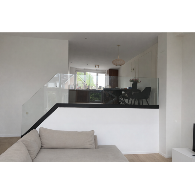Door het gebruik van transparant veiligheidsglas blijft de ruimte open en licht, terwijl de balustrade tegelijkertijd zorgt voor optimale veiligheid rondom het niveauverschil. Het ontwerp versterkt de ruimtelijkheid van de woonkamer en eetkamer en vormt een subtiele, maar stijlvolle afscheiding.