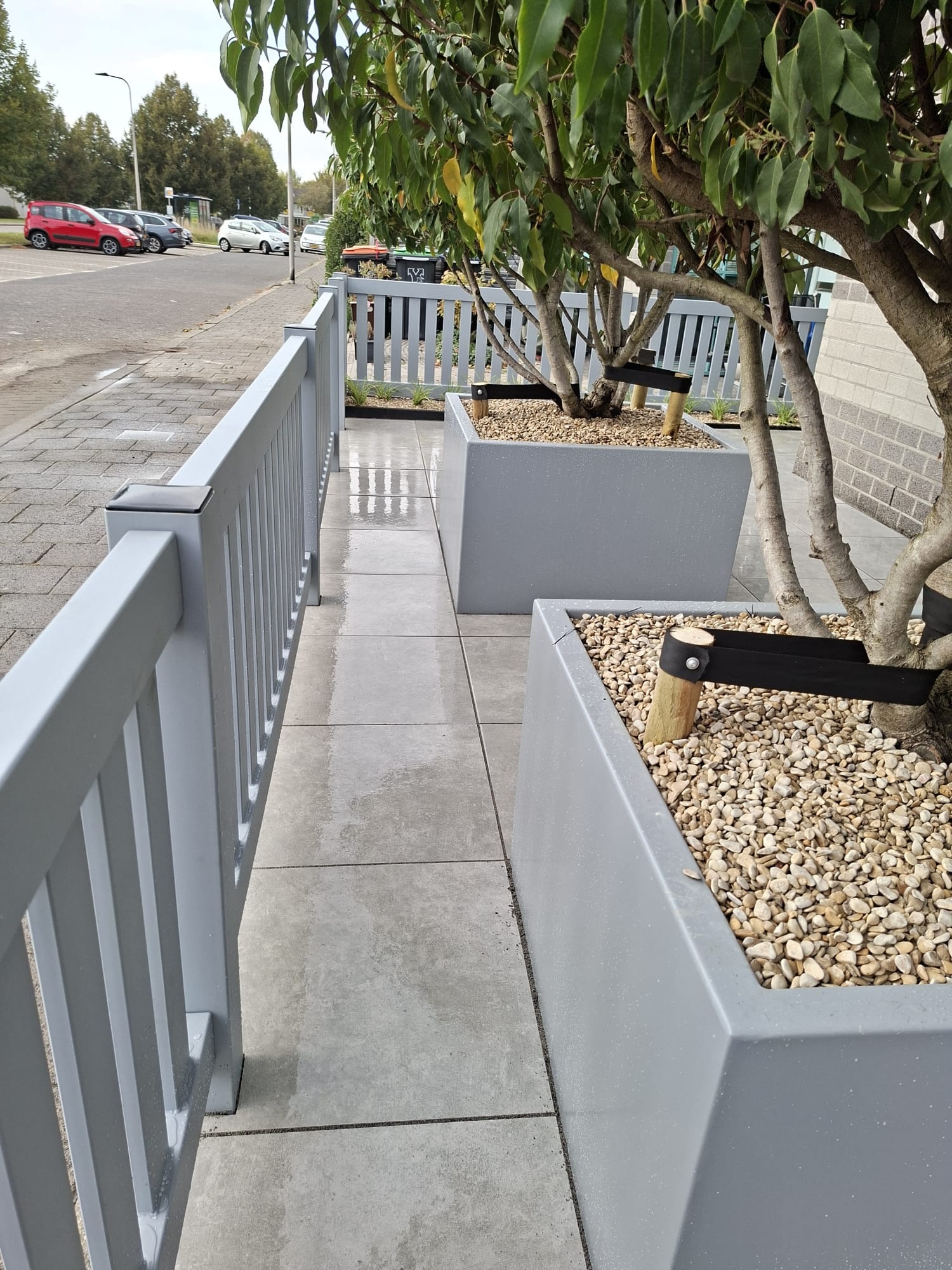 Dankzij de combinatie van modern hekwerk, strakke bestrating en hoogwaardige plantenbakken heeft deze voortuin in Leusden een complete, eigentijdse uitstraling gekregen.