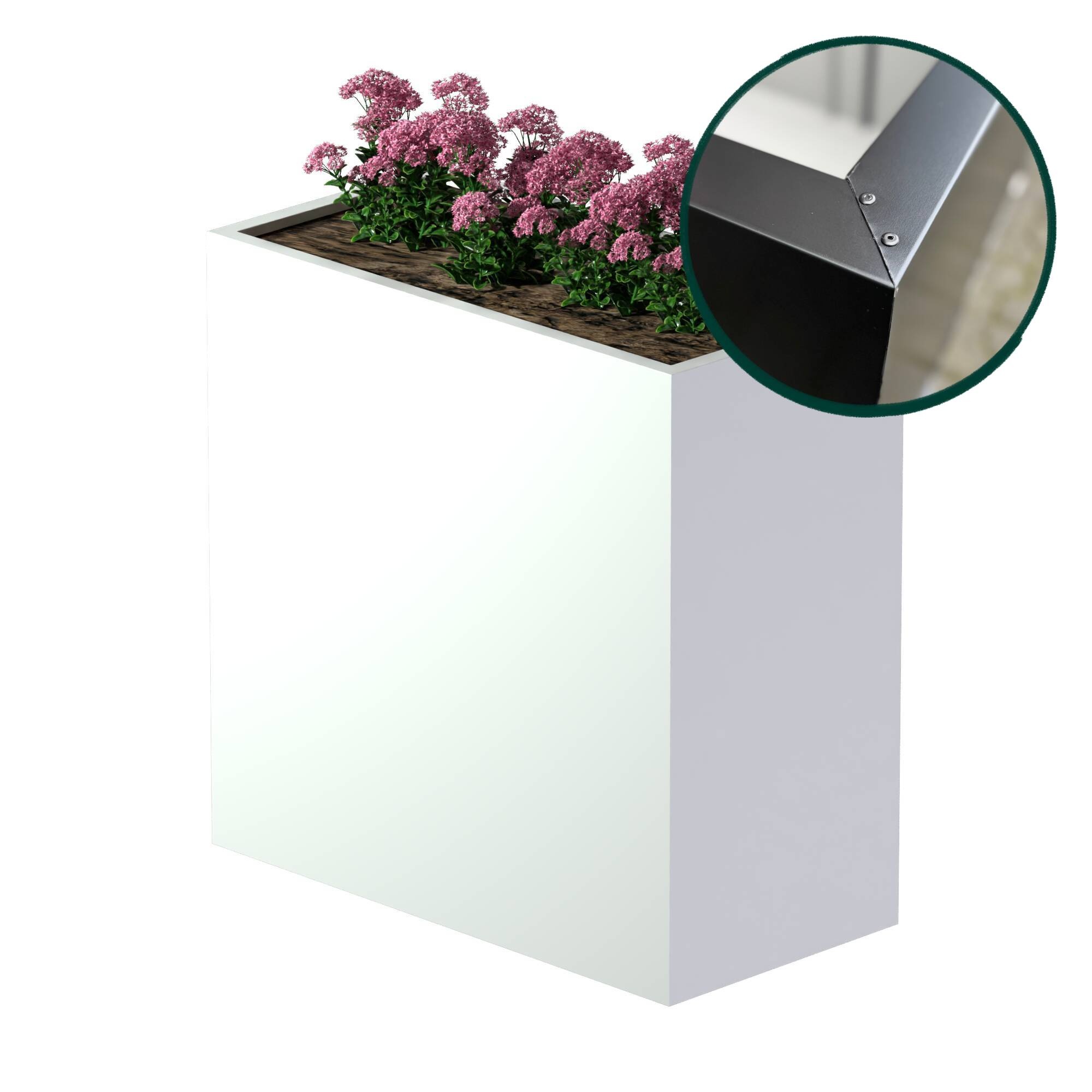 Onze plantenbakken met standaard afwerking zijn altijd vervaardigd uit hoogwaardig verzinkt metaal, waarna ze worden gecoat met een weersbestendige coating. Het plaatmateriaal bestaat uit een speciale mix van 95% zink en 5% aluminium. Deze verhouding staat garant voor een goede corrosiebestendigheid!