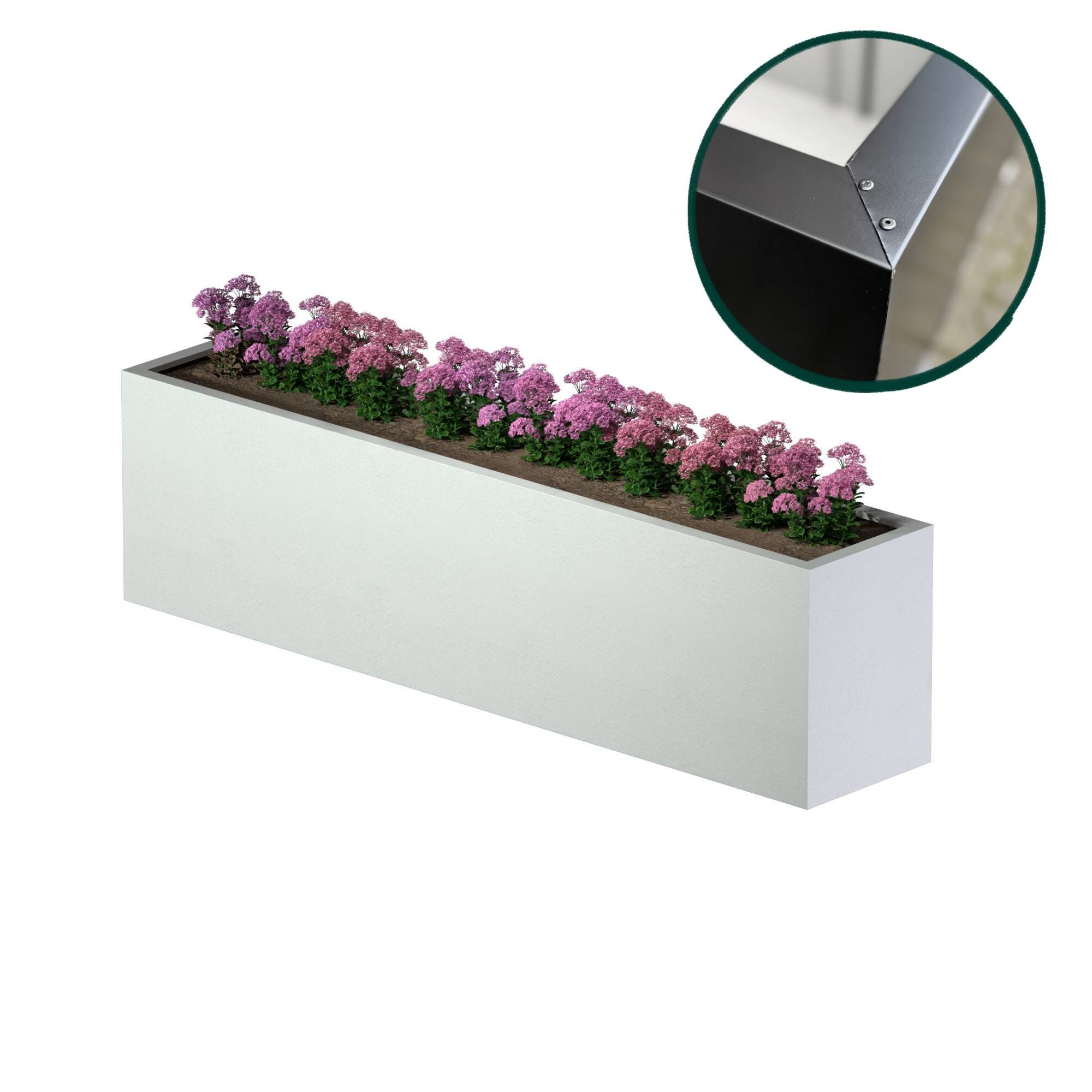 Onze plantenbakken zijn altijd vervaardigd uit hoogwaardig verzinkt metaal, waarna ze worden gecoat met een weersbestendige coating. Het plaatmateriaal bestaat uit een speciale mix van 95% zink en 5% aluminium. Deze verhouding staat garant voor een goede corrosiebestendigheid!