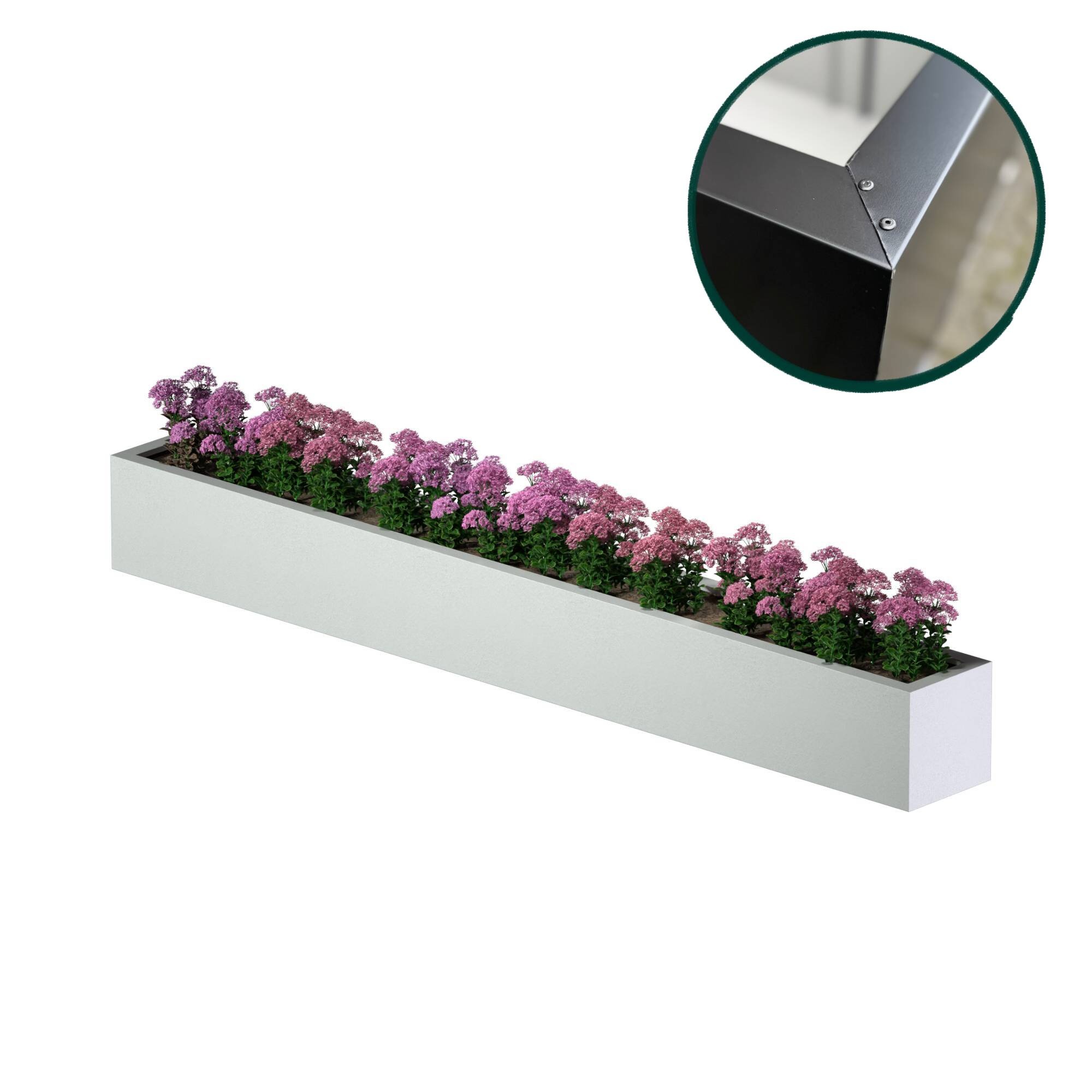Onze plantenbakken zijn altijd vervaardigd uit hoogwaardig verzinkt metaal, waarna ze worden gecoat met een weersbestendige coating. Het plaatmateriaal bestaat uit een speciale mix van 95% zink en 5% aluminium. Deze verhouding staat garant voor een goede corrosiebestendigheid!