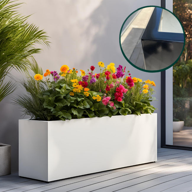 Elke stalen plantenbak wordt voorzien van een 2-laagse poedercoating, wat zorgt voor een krasvaste, UV-bestendige en weerbestendige afwerking. Bovendien kun je kiezen uit verschillende RAL-kleuren, zodat jouw buitenplantenbak perfect past bij je tuin of terras.